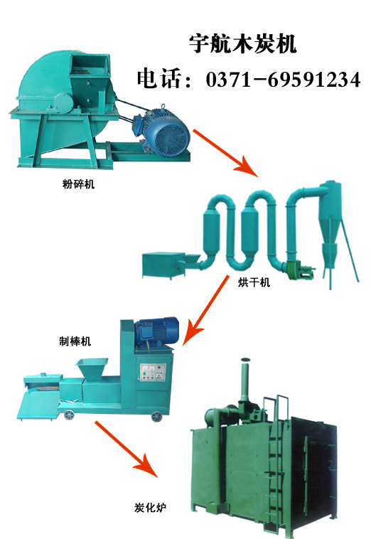環(huán)保木炭機設(shè)備是把原料竹木鋸末、花生殼、玉米棒、甘蔗渣、棉花稈、玉米稈、稻谷殼、雜樹枝等經(jīng)木屑粉碎機粉碎成 10mm之內(nèi)的顆粒狀,經(jīng)烘干機烘干使之含水份含量在12%以內(nèi),入制棒機經(jīng)高溫,高壓使之成型后放入炭化爐進行炭化, 即成成品木炭。該產(chǎn)品密度大、體積小、可燃性好,是一種新型的環(huán)保清潔木炭,可替代薪柴及燃煤,尤其適用于北方地 區(qū)秋冬燒炕取暖、大棚升溫或作普通生活燃料。環(huán)保木炭機價格不高,效果卻十分明顯。廣泛應用在餐飲,農(nóng)業(yè),工業(yè)等 眾多領(lǐng)域。